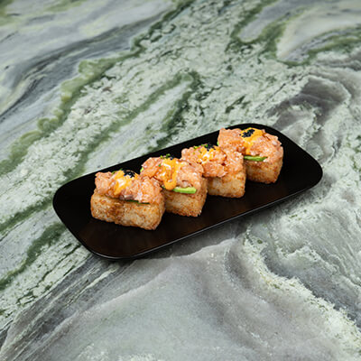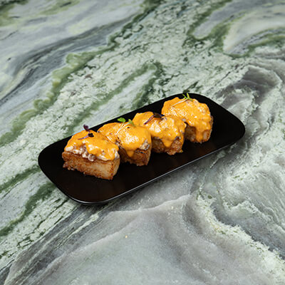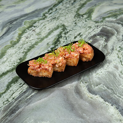 Crispy rice, akam mixed with tobiko and