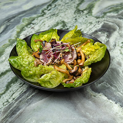 Baby gem tossed with sautéed mushrooms and
